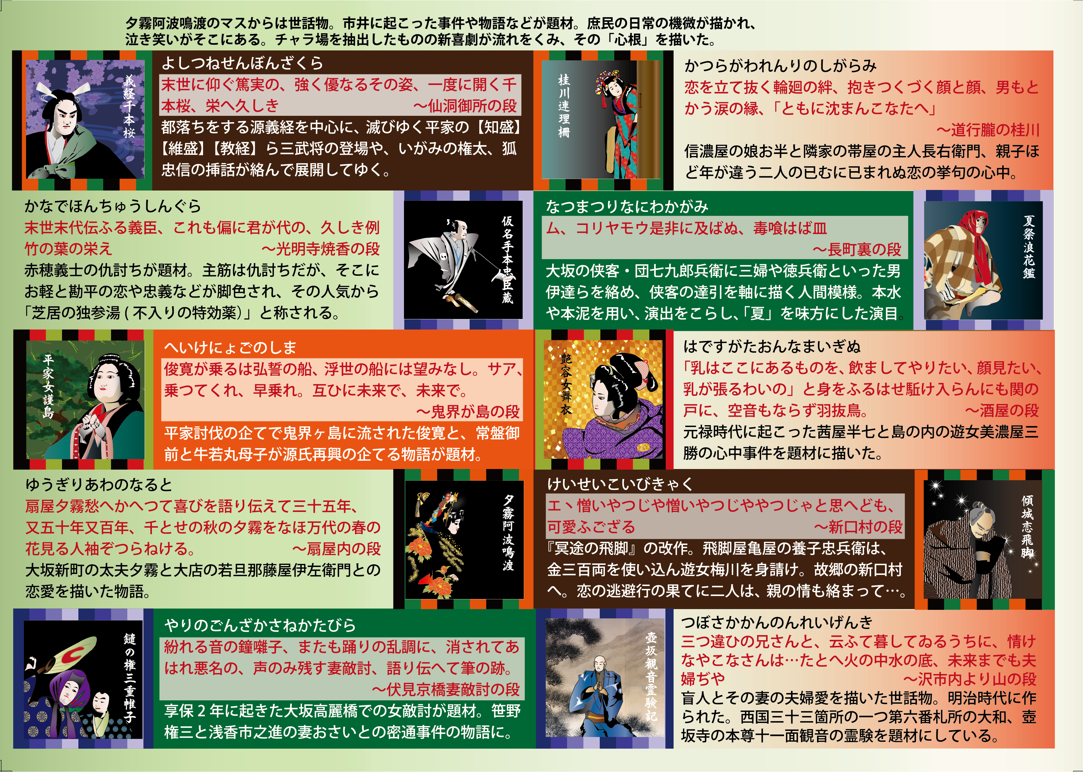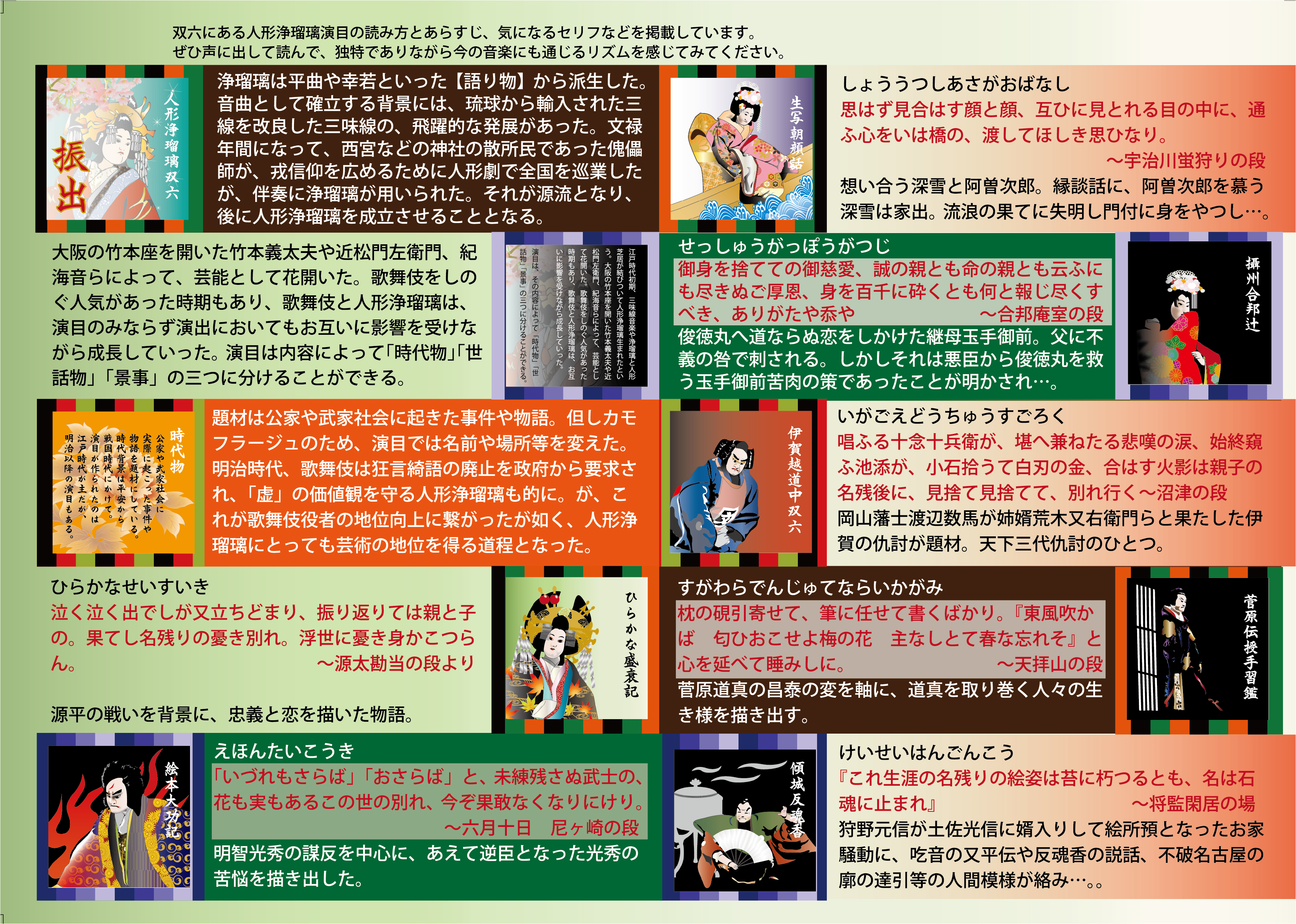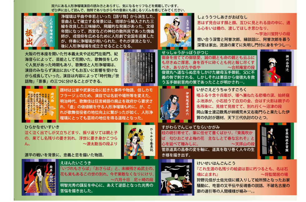 人形浄瑠璃の三大演目は『義経千本桜』『仮名手本忠臣蔵』『菅原伝授手習鑑』。実は歌舞伎と同じなのです。江戸時代、人形浄瑠璃で大人気となった三作、歌舞伎でも演じてみようということになり、ともに三大名作となったのです。