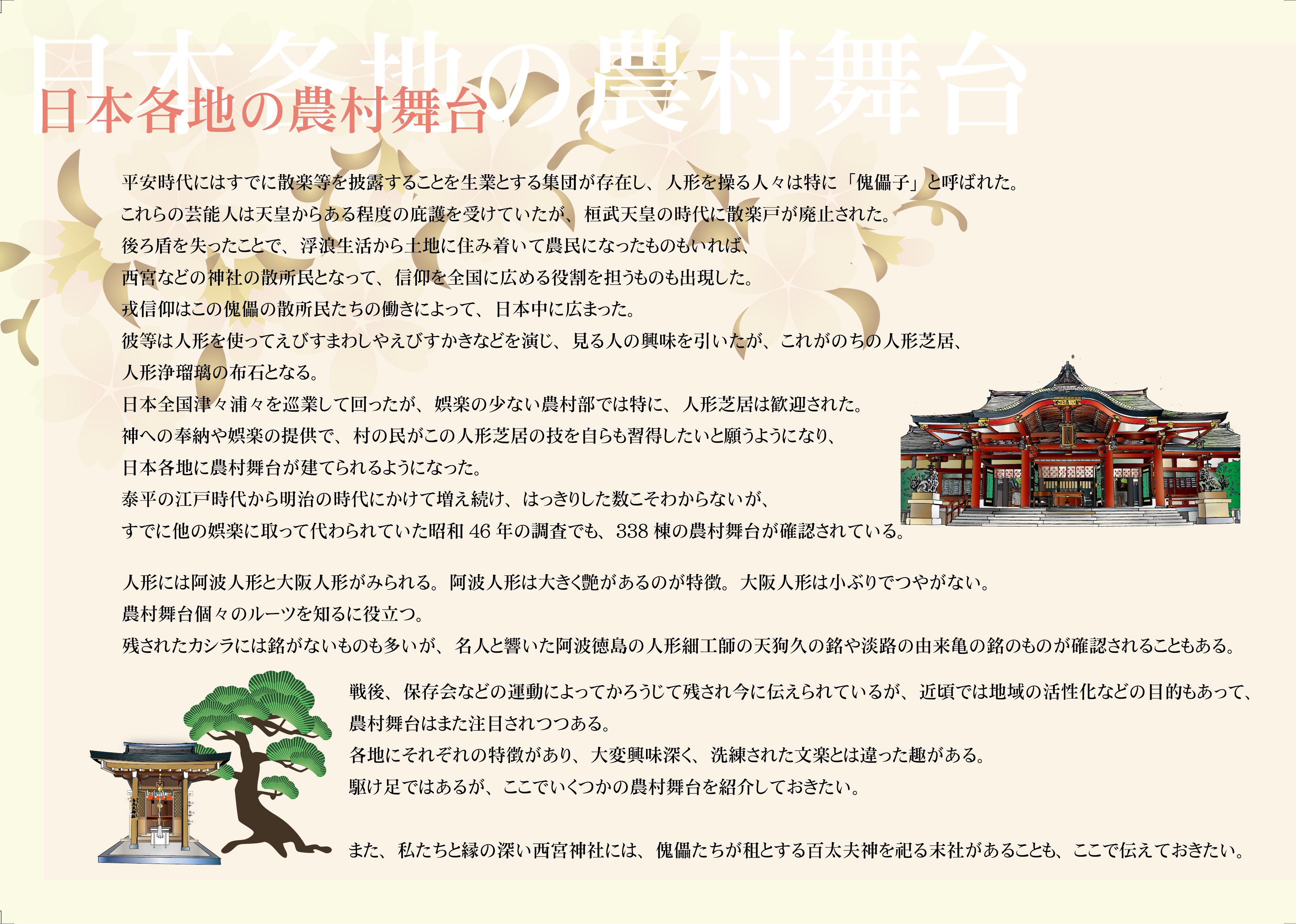 人形遣いの祖である百太夫神も祀られています。えびす人形を操り全国を回りえびす信仰を広め、また人形浄瑠璃に発展していったとも言われています。