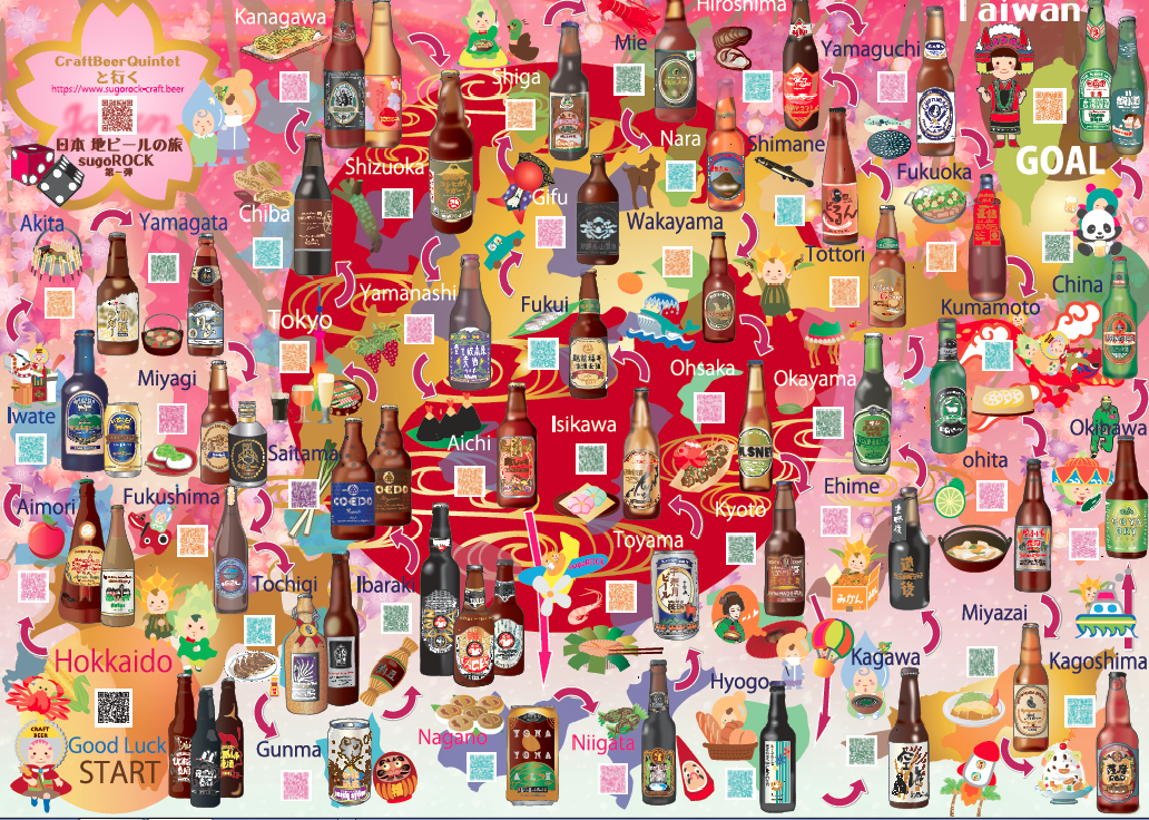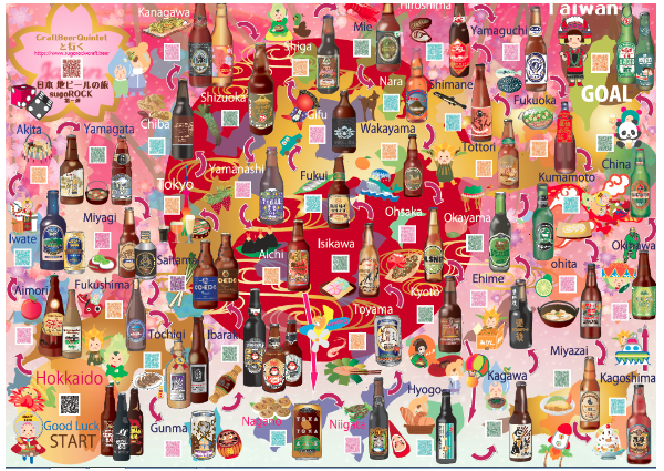 2016年度に実験的に作成した双六です。2016年度に現存する各地の瓶ビールの絵で日本を巡る双六にしています。2021年度では変化があると思われます。ビールの横にあるQRコードで各ブルワーリーに飛ぶことができます。