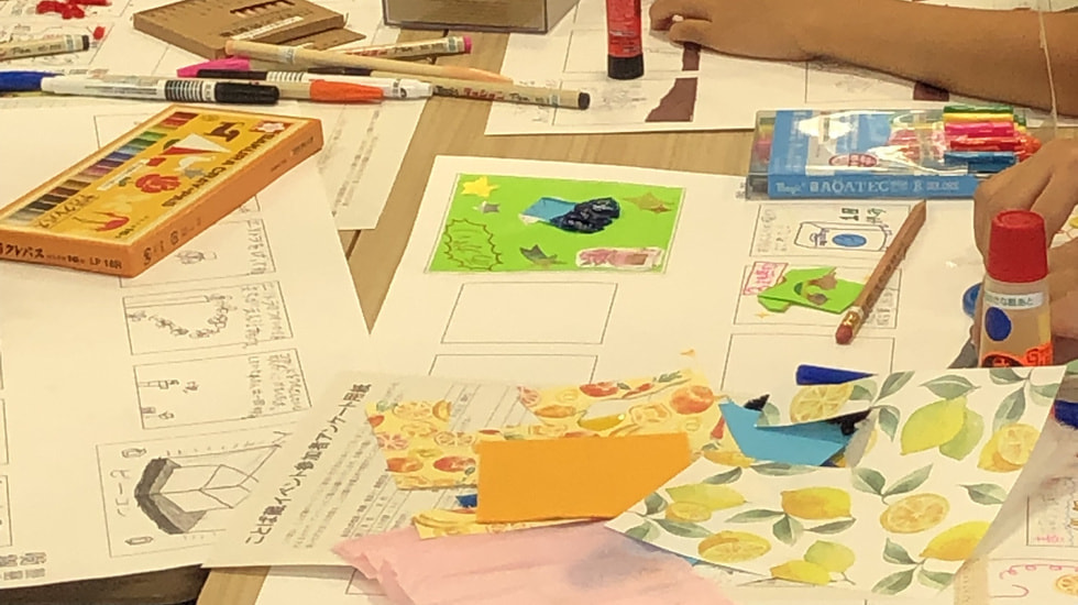 世界にひとつだけのオリジナルすごろくを作ろう! 2022年度版はこちらへ2022年8月9日~11日の3日間にわたり伊丹市立図書館ことば蔵で開催しました。連日の猛暑にもかかわらず皆さん出席され、がんばってすごろくを仕上げました。低学年の参加者は長時間の持続がまだ難しいため、保護者同伴をお願いしました。自分でテーマを決めてすごろくを仕上げる作業には、持続力、仕上げる責任感、流れを考えたり絵マスを工夫する創造力など、様々な効果が期待されます。最終日には皆さんの前で自分のすごろくを発表する課題が待っています。人前で話すことの練習としてよい機会と考えているからです。仕上がったすごろくはどれも自慢の作品です。コロナ禍で3年ぶりの開催となりました。毎回、同じものはなく、其々に個性的で素敵なすごろくが出来上がります。 |