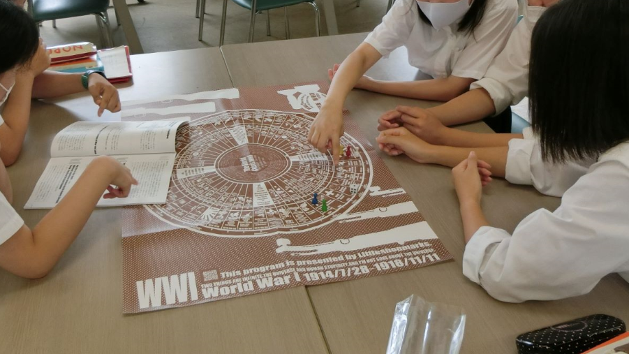 双六で学ぶ双六は学ぶことを目的に生まれ発展してきた歴史があります。当会も少し難しいと思われる内容を双六にする試みをしています。写真はWW1(第一次世界大戦)すごろくを高校生たちが副読本で確認しながら遊んでいます。 |
